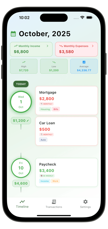 Am I Good? is a privacy-focused budgeting app designed to help you see exactly what’s coming in and what’s going out — without the complexity of traditional finance tools. It answers the simple question "Do I have enough money?" by showing your projected daily balance over time. Users input their starting balance and recurring transactions (income/expenses), and the app creates a visual timeline showing exactly when they'll have money and when they might run low. The core feature is a scrollable timeline that displays daily balances, helping users avoid overdrafts and make informed spending decisions.